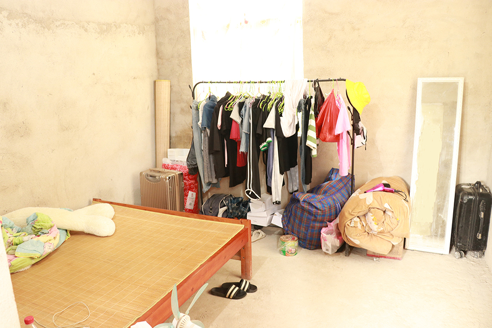 小小的房子里,剛進到前廳,抬頭就能看到墻上掛著的貧困證明等文件。周圍沒有擺設(shè)任何的家具,凳子還是梁同學急急忙忙從房間里搬出來的。后面則是姐弟兩人的房間。梁美麗房間的東西略微比弟弟多一些。但說是多一些,其實也只有一張床,一面鏡子,兩個旅行箱,和一些掛在架子上的衣服而已。