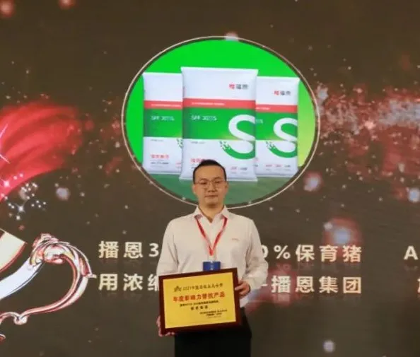 2021年12月11日,第11屆中國農(nóng)牧業(yè)風(fēng)云會(huì)、農(nóng)財(cái)寶典新牧網(wǎng)年會(huì)暨廣東省現(xiàn)代畜禽產(chǎn)業(yè)園研討會(huì)在廣州閉幕。在2021年中國農(nóng)牧業(yè)風(fēng)云榜頒獎(jiǎng)會(huì)上,播恩集團(tuán)產(chǎn)品“播恩3011S 30%保育豬用濃縮飼料”榮獲“年度影響力替抗產(chǎn)品”獎(jiǎng)項(xiàng),播恩集團(tuán)技術(shù)服務(wù)副總監(jiān)巴少波上臺(tái)領(lǐng)取獲獎(jiǎng)牌匾。