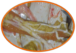 圖3- 糞便上有米粒大小,乳白色的節(jié)片 圖4- 腸粘膜肥厚,可見蟲體吸附于小腸粘膜上