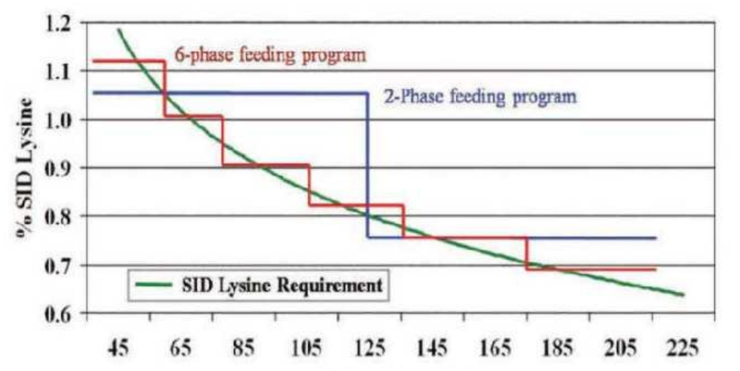 圖1展示的是商品豬從保育到育肥出欄,分兩階段飼喂和六階段飼喂的差異。兩種配方飼喂,方法雖然操作簡單,但會造成飼料隱性浪費。考慮到前期豬群體重小采食量低,飼料營養(yǎng)濃度一般較高,導致豬在生長過程中大多數(shù)時間處于營養(yǎng)過剩階段,營養(yǎng)物質(zhì)不能充分利用,多余的營養(yǎng)素増加了豬的代謝負擔,且會隨糞便排出體外,造成飼料成本增加。過剰的營養(yǎng)還會增加糞便排放量,增加糞污處理難度。而多階段料飼喂則是比較精細化的飼喂方式,可保證豬群大多階段營養(yǎng)物質(zhì)的攝入正好可滿足自身的需要,依靠這種飼喂方法可滿足豬群的實際氨基酸需要,實現(xiàn)精準飼喂及有效降低生產(chǎn)成本。在設(shè)計多階段日糧飼喂方案時可通過原料及營養(yǎng)指標梯度設(shè)計來減少換料應(yīng)激。