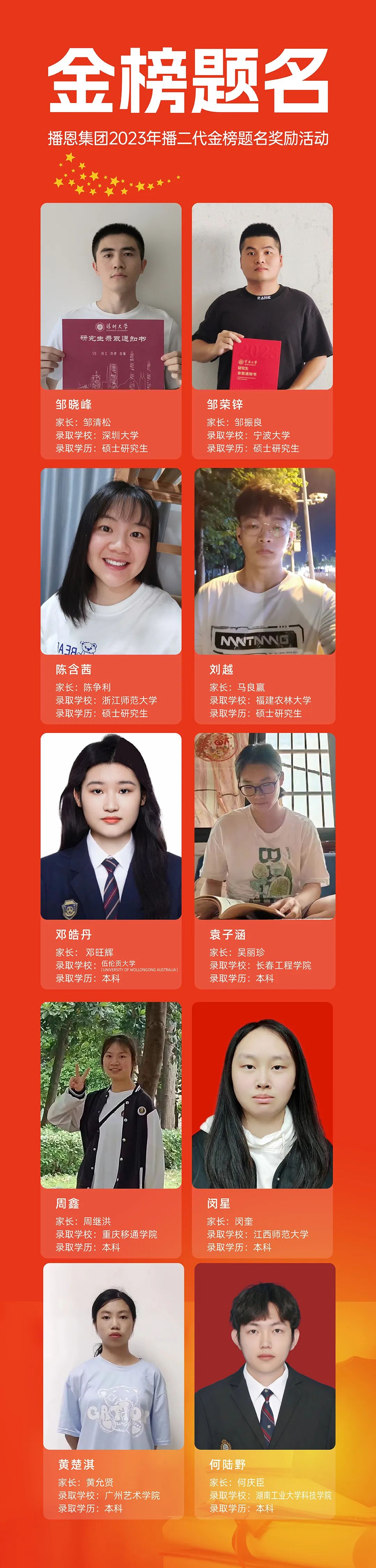2023年集團職工子女有10人考入高校,其中碩士4人,本科6人。為鼓勵更多的“播二代們”成為有理想、有行動、有擔(dān)當(dāng)?shù)那嗄?,同時也給職工帶來滿滿的歸屬感與榮耀感,集團除了現(xiàn)金獎勵外,還送上了董事長鄒新華先生的祝賀函、自著的《百煉成王—王陽明》一書、精美禮品等。我們也對其中一些具有代表性的家長進行了采訪,下面是他們的一些采訪紀(jì)實。