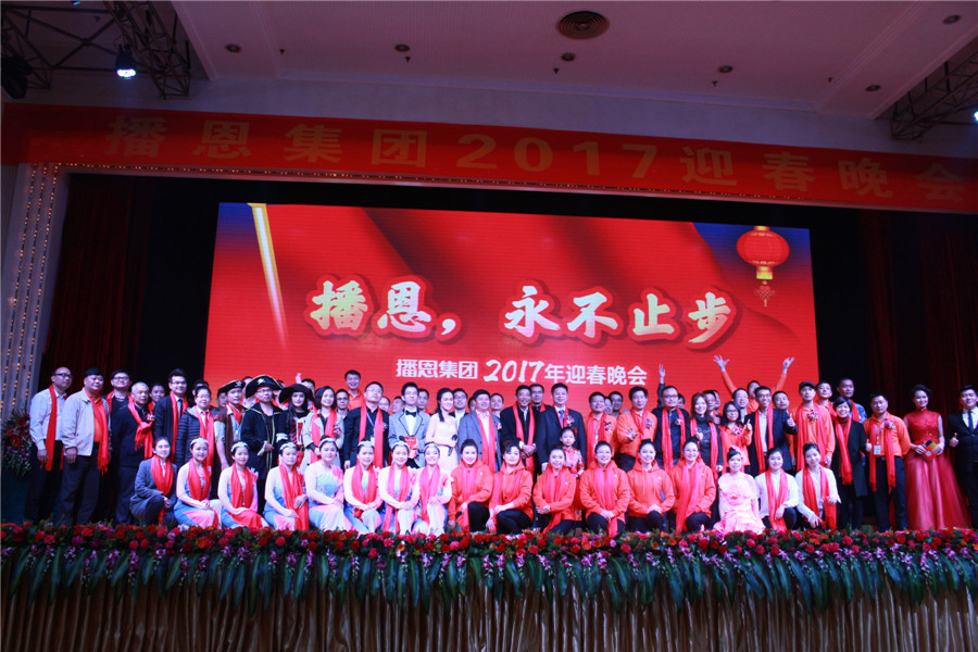 律回春暉漸,萬象始更新, 2月5日,播恩集團在番禺祈福酒店隆重舉辦了以“播恩,永不止步”為主題的2017年度公司年會。集團總裁鄒新華先生出席晚宴,并發(fā)表新年致辭。本次晚會共有來自各大區(qū)/事業(yè)部、工廠生產(chǎn)和管理代表,以及總部職能部門近300名員工一起共度新春。同時,集團還特邀了華南農(nóng)業(yè)大學傅偉龍教授、鄧銜柏教授等專業(yè)人士和同行業(yè)合作伙伴共享狂歡。